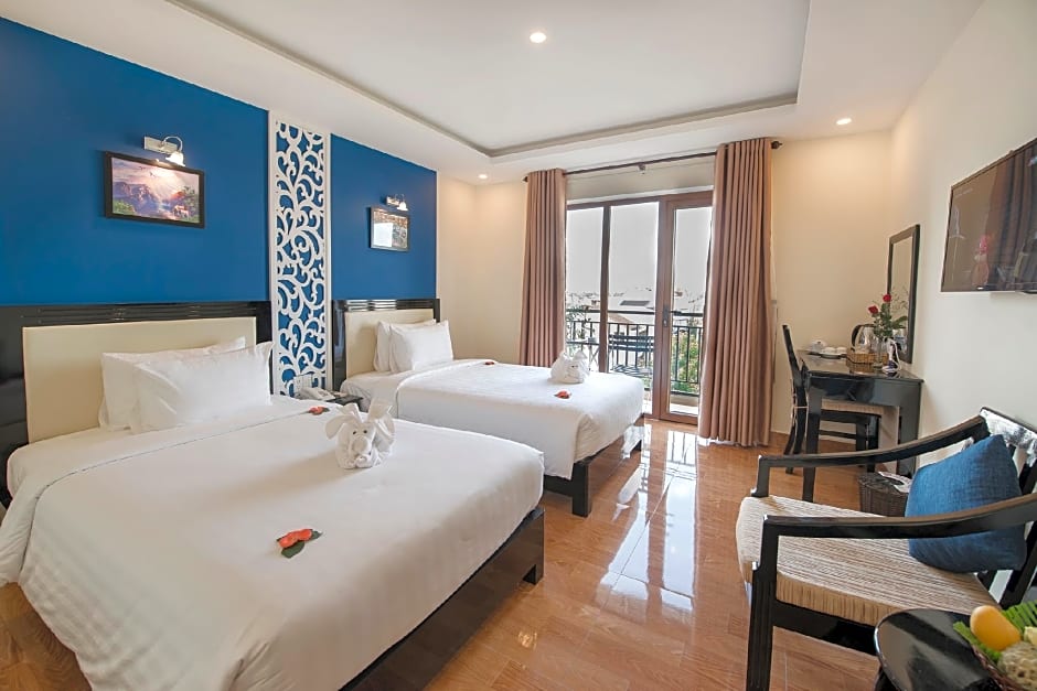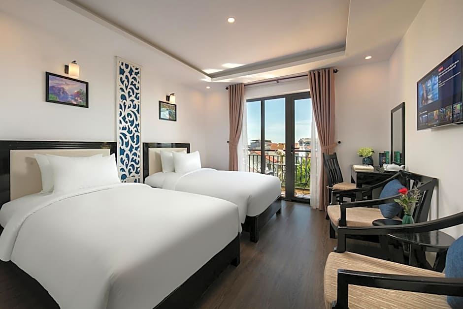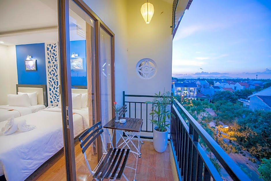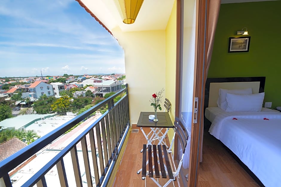 The Hoi An Rose Garden Hotel offers a variety of room types including Deluxe Twin Rooms, Family Rooms with Balcony, Junior Suites with Balcony, Superior Triple Rooms with Balcony, Deluxe Double Rooms with Balcony, Superior Twin Rooms with City View, and Queen Rooms with Balcony. Smoking is not allowed in any of the rooms. The rooms accommodate different numbers of adults and children, and the bed sizes range from twin beds to king-size beds.