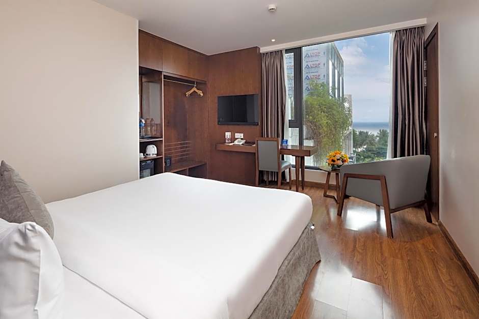 The room we had here was fantastic and had an amazing view. We loved having a separate shower and toilet and a very large size bathroom. The bed was very comfortable and large. Having a seating area was very good as it was nice to sit and look at the ocean and we even saw fireworks one night across at the island. This hotel was down a lane way but it is wide enough and has turning space for a car to drop off and pick up. There was also a little bar area across from the front entrance where you could get good priced beers and other drinks. The location of this hotel was fantastic and only around the block and you could walk across the road to the beach. There is a small Vincom shopping centre around the corner that has a winmart in it. There are also a few good local restaurants nearby as well as local laundry where we got ours done a couple of times for a good price. Housekeeping did a great job and arrived at approx the same time every day which made it easy to make sure we were out of their way to clean. They seemed very friendly whenever we said hello to them exiting our room.
