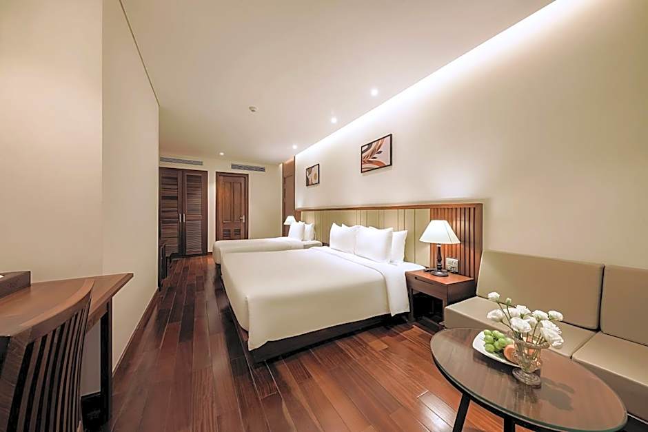 The Green Beach Hotel in Nha Trang offers a variety of room types including Twin, Double, and Suite rooms. The rooms range in size from 237 sqft to 538 sqft. Smoking is not allowed in any of the rooms. Occupancy varies from accommodating 2 adults and 0 children to 3 adults and 1 child. Bed options include Twin beds, Double beds, King size beds, and a combination of Sofa bed and King/Twin beds.