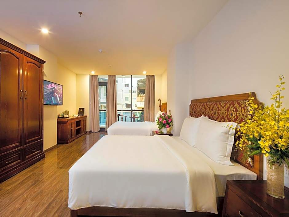 At the Red Sun Nha Trang Hotel, guests can choose from several room types including Superior Double or Twin Rooms with City View, Deluxe Triple Rooms with Balcony and Sea View, Twin Rooms with City View, Deluxe Double Rooms with Balcony and Sea View, Family Rooms with Balcony, and Suites with Balcony. The rooms range in size from 269 sqft to 592 sqft and can accommodate various numbers of adults and children. Smoking is not allowed in any of the rooms. The beds available include twin beds, queen-size beds, and king-size beds.