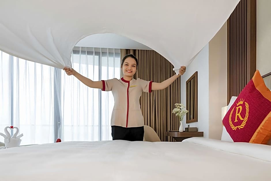 Guests at Regalia Gold Hotel can enjoy a variety of leisure amenities during their stay. They can spend time at the outdoor swimming pool, which boasts an infinity design and rooftop location with stunning views. For families, there is a separate kids' pool available. Additionally, guests can relax at the hotel's two restaurants, THE SUN and THE MOON, which offer a mix of American, Vietnamese, Local, and Asian cuisine. Those looking to stay active can make use of the fitness center on-site. With free toiletries provided in the room and air conditioning to keep comfortable, guests are sure to have a relaxing and enjoyable stay at the hotel.