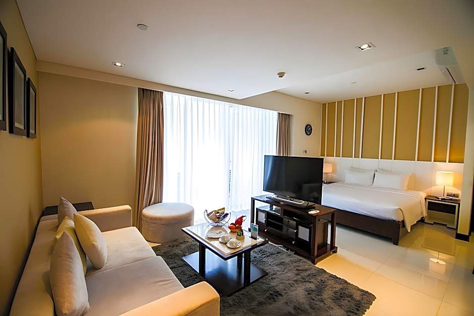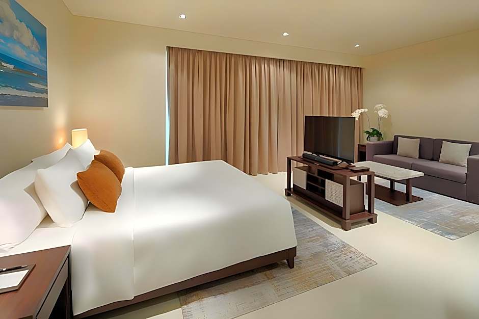 This spacious air-conditioned apartment is luxuriously furnished with a separate living and dining area, sofa seating area and private balcony with sea view.