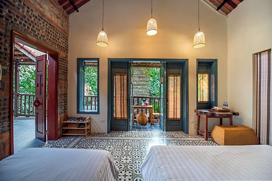 The architecture of the building has a vintage-natural style and we loved it. It is not a village house, nor a villa in the village, it is right in the middle. We rented a motorbike from the hotel, the price was reasonable, the same as the market price. We also bought our return ticket to Hanoi from the hotel. They helped with these matters. The lady at the reception, I think her name might be "Ha". She is the sweetest person we met in Vietnam. I hope you always stay happy and energetic. It was a pleasure to meet you. 💐 ps. don’t forget to say hello to the cat.. :)