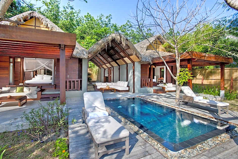 This spacious sea view villa features 2 large master bedrooms, 2 bathrooms, 4 shower facilities and a private swimming pool. The living room connects the 2 bedrooms and offer a comfortable sofa. Villa includes 24-hour butler service, one-time speedboat transfer and one-time shuttle service between Nha Trang city and the resort (not apply for check-in and check-out date). Please note that the villa can accommodate up to 1 extra bed at an extra charge. Please note that one child aged 3 years old and below stays for free on an existing bedding.
