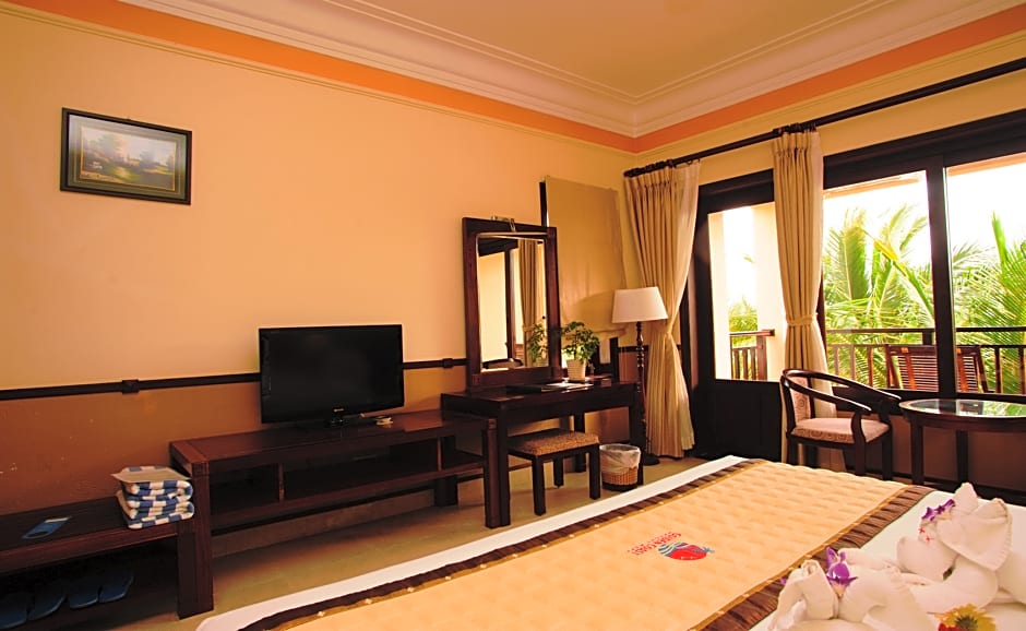 Modern Vietnamese-style rooms with classic wood furnishings and a flat-screen TV.