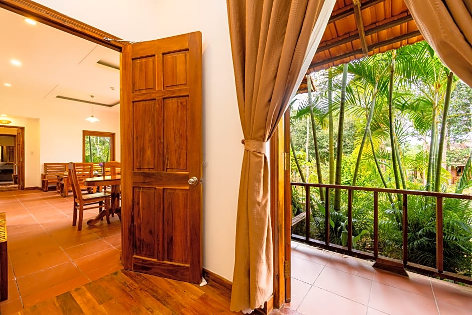 The resort is located at the end of a street, with the jungle just behind it. This makes the resort very tranquil. The resort sits in a lush garden and during the evenings you hear the toads/frogs and all kinds of animal noises, which I really loved. We even saw monkeys in the trees behind our room almost every morning. The pool is amazing and we loved the evening dips after a long day of touring the island. The beds are really comfortable and they clean your room and change towels every day if you wish so. The receptionists are very friendly and the cleaners are lovely ladies. It is a bit isolated, but if you rent your own motor bike, this is a perfect place to stay. We booked this place for 4 nights to unwind after traveling vietnam for 5 weeks, but ended up booking 3 more nights and stayed 1 whole week. I think that says enough!!! I really recommend this place if you're looking to chill.