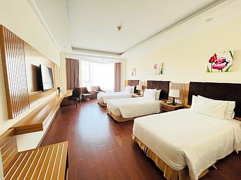 The Muong Thanh Quy Nhon Hotel offers various types of rooms, including Deluxe Twin Rooms, Suites, and Deluxe Double Rooms. The Deluxe Twin Rooms and Deluxe Double Rooms have a room size of 388 sqft and can accommodate 2 adults and 1 child. Both room types do not allow smoking and have either 2 double beds or 1 king-size bed, respectively. The Suites have a larger room size of 646 sqft and also accommodate 2 adults and 1 child. They have a queen-size bed and do not allow smoking.